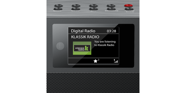 A large colour display located centrally on the front panel shows the current radio station and other information such as a slide show or station logo. The radio is operated using the buttons on the top of the device or the handy infrared remote control. If required, the DAB radio automatically switches off after you fall asleep using the integrated snooze function or starts playback at the programmed wake-up time in the morning. Different wake-up routines can be set for weekdays or weekends.